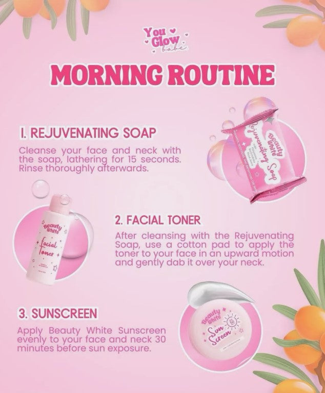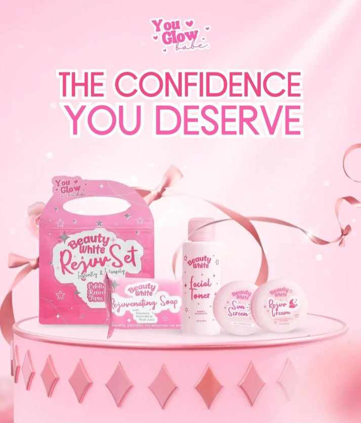 You Glow Babe Beauty White Rejuvenating set will lighten dark spots and acne marks, smoothen your face, unclog and lessen open pores, and prevents acne. This set gently peels away the top layer of the skin, revealing fairer, smoother , and renewed skin.